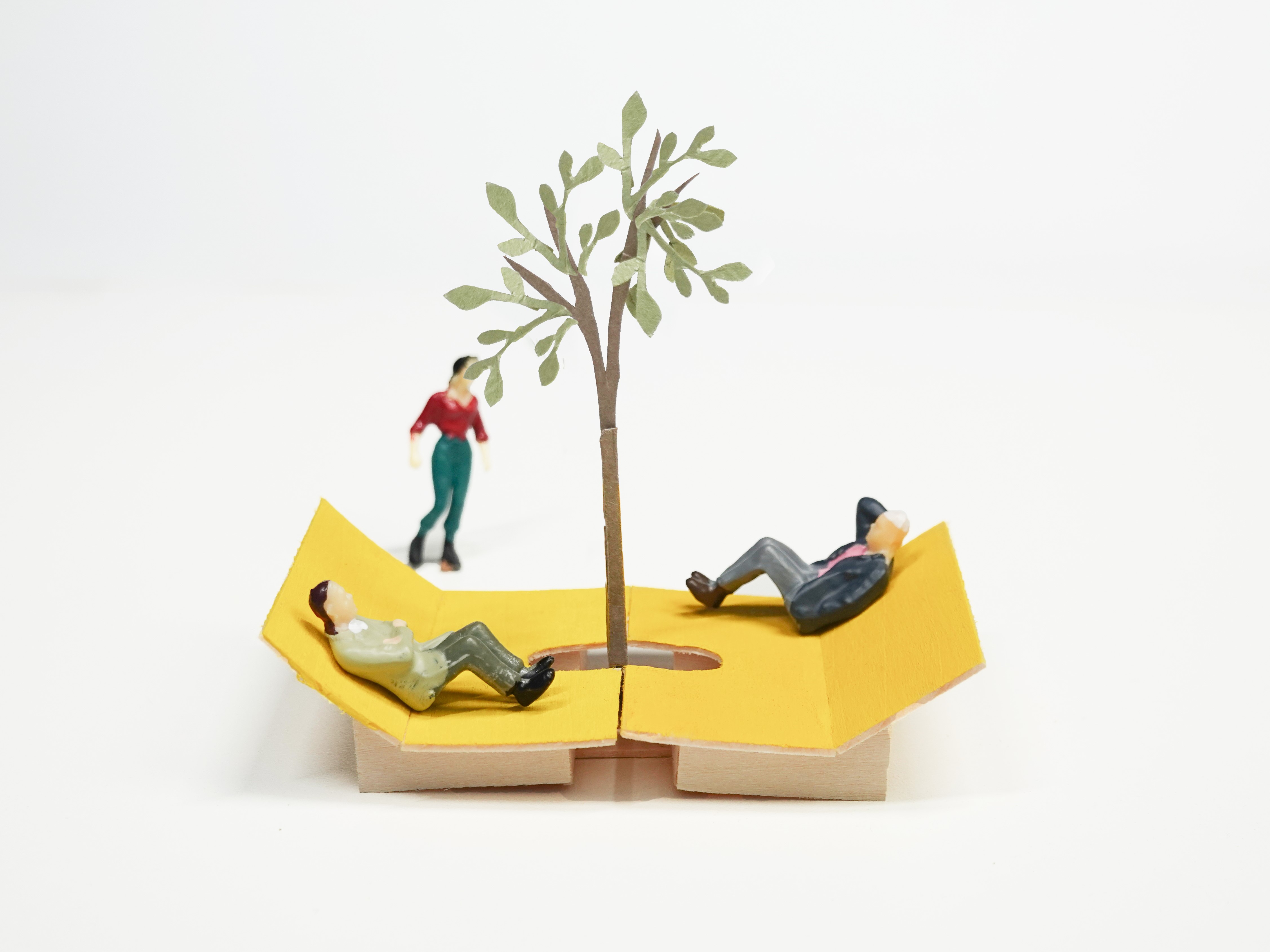 Designul modular al instalației propune o serie de bănci plug-in, prevăzute cu decupaje speciale pentru arbori, transformând fiecare spațiu de ședere într-o interacțiune intimă cu natura, în care copacul devine un companion al celor care se așază. Datorită flexibilității și caracterului său adaptabil, instalația se poate integra cu ușurință în diverse peisaje urbane – de la piețe aglomerate până la colțuri liniștite de cartier. Prin încurajarea unor interacțiuni mici, dar semnificative cu natura, proiectul reaprinde atașamentul față de mediul urban, transformând spațiul public într-o pânză vie de conexiuni și momente împărtășite.